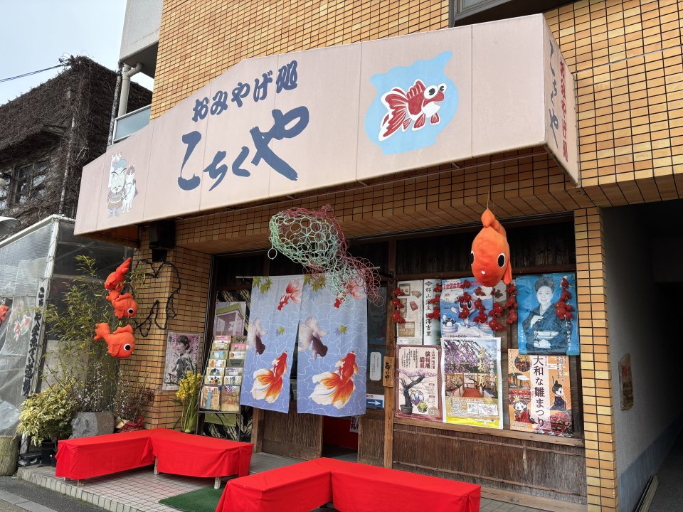 金魚をモチーフにした小物、郡山仏閣等をデザインしたお土産品、記念品を販売しているお土産処に併設された金魚すくい道場へ入ります。