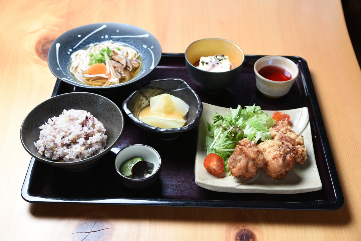 斑鳩名物竜田揚げランチは、塩麹に漬け込んだ国産鶏の軟らかい竜田揚げに、そうめん(冬季はにゅう麺)、小鉢などが付く看板メニュー。