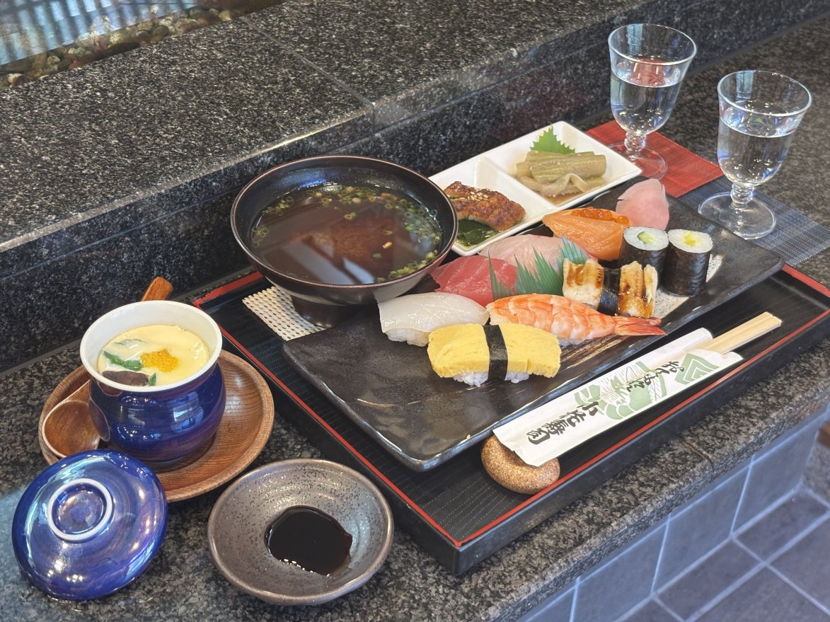 右上:小花寿司:握りずし膳(握りずし、茶わん蒸し、赤だし、付け合わせ2種)+奈良の地酒(季節のおすすめ)
